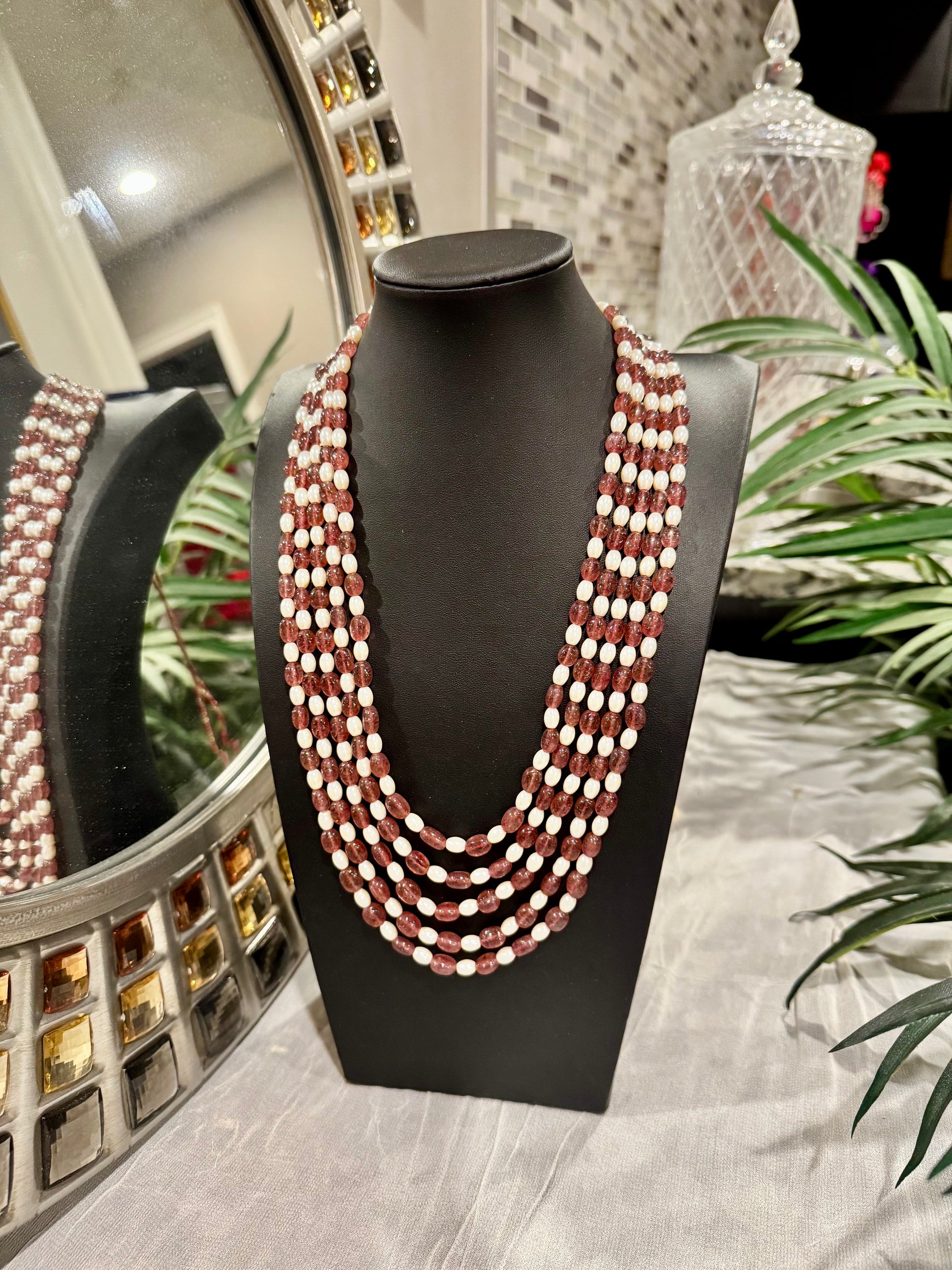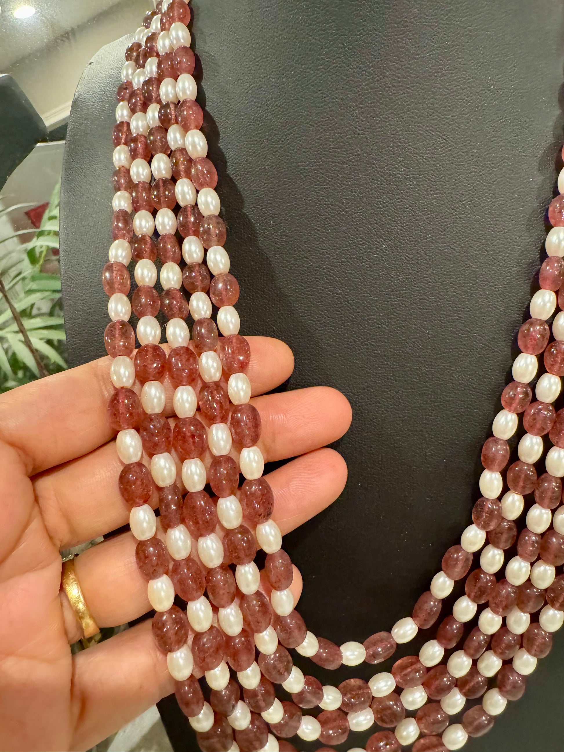 Natural Pink strawberry quartz oval beads and pearls necklace